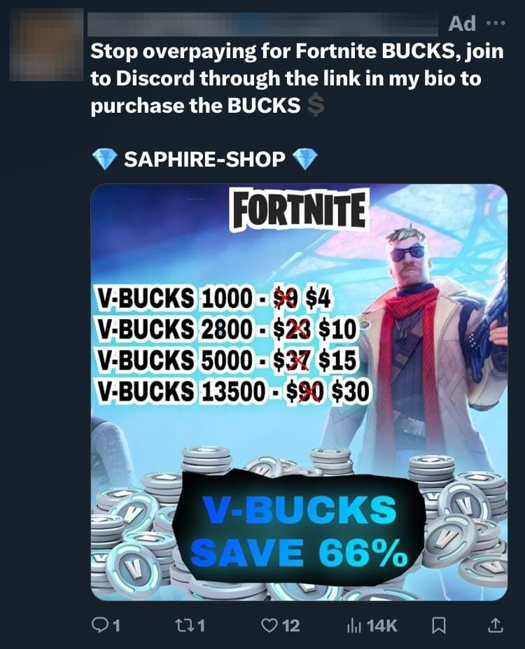In triangulation scams, fraudsters use stolen credit cards to buy V-Bucks on legitimate accounts, then sell or trade those accounts— often loaded with rare items— at discounted prices on underground markets. Buyers risk having the V-Bucks revoked by Epic when the fraud is detected, or facing account bans. Account trading also involves scams where “sellers” promise loaded profiles but deliver nothing after payment, or use the transaction to phish for more details. This affects parents indirectly through unauthorized charges or kids losing access to their progress.